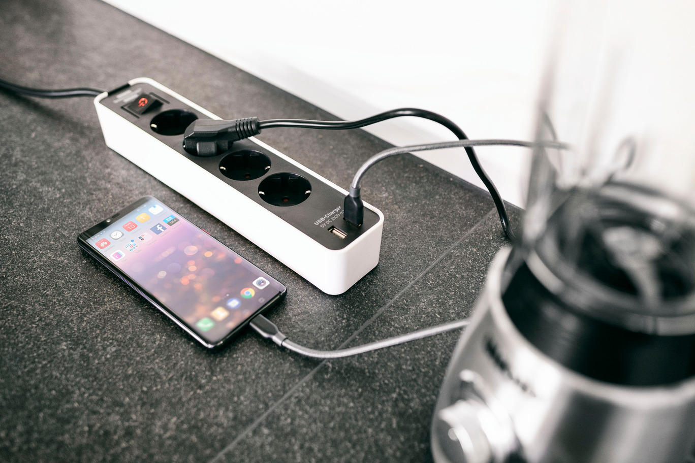 Ecolor Steckdosenleiste mit USB-Ladefunktion 4-fach weiß/schwarz 1,5m H05VV-F 3G1,5 mit Schalter