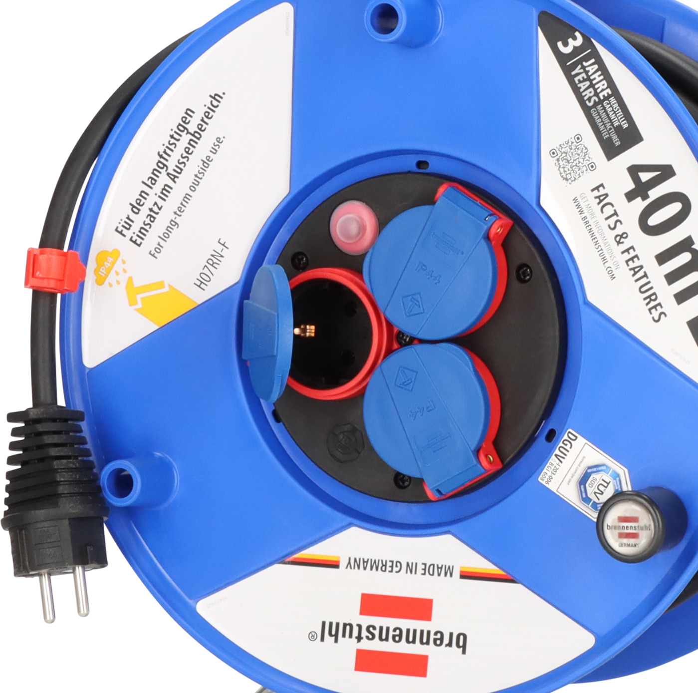 Die Garant IP44 Gewerbe-/Baustellen-Kabeltrommel mit 40m Kabellänge in der Farbe blau von Brennenstuhl eignet sich ideal für den Baustelleneinsatz und den Einsatz im Freien. Sie überzeugt außerdem durch folgende Eigenschaften: